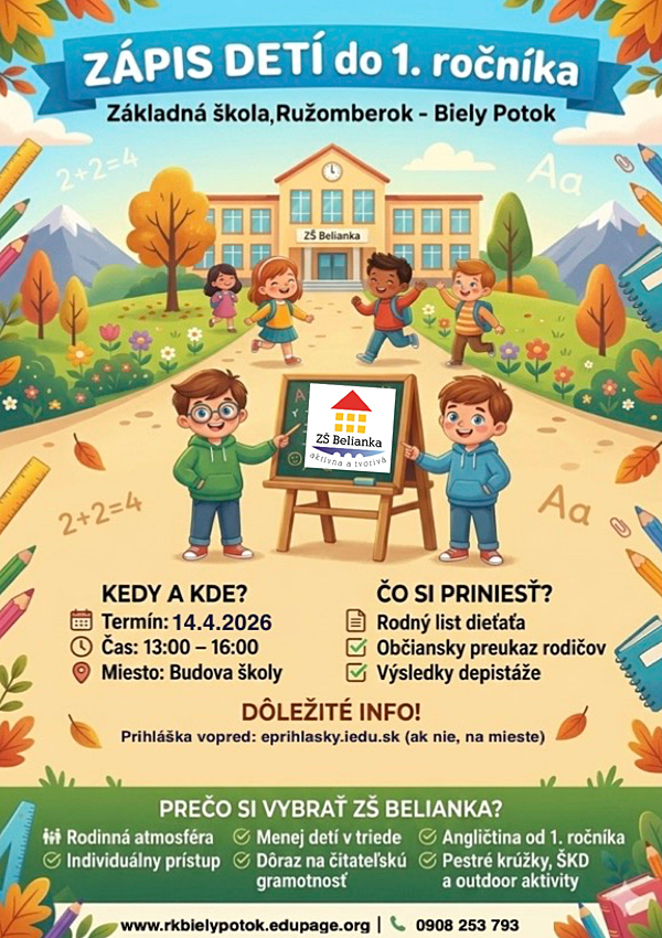 zápis do 1. ročníka do našej školy ZŠ Ružomberok – Biely Potok sa uskutoční 14.04.2026 (utorok) v čase od 13:00 do 16:00 hod.